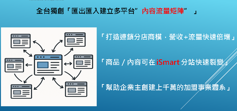 更關鍵的是,ISMART不只是工具,而是一套完整的「裂變系統」。透過AI生成內容矩陣,每一個加盟店/加盟站都能成為流量節點,彼此串聯,形成網狀擴散。這種模式不僅提升品牌曝光,更讓加盟體系從「單點經營」升級為「平台化運作」,真正達到規模經濟。
